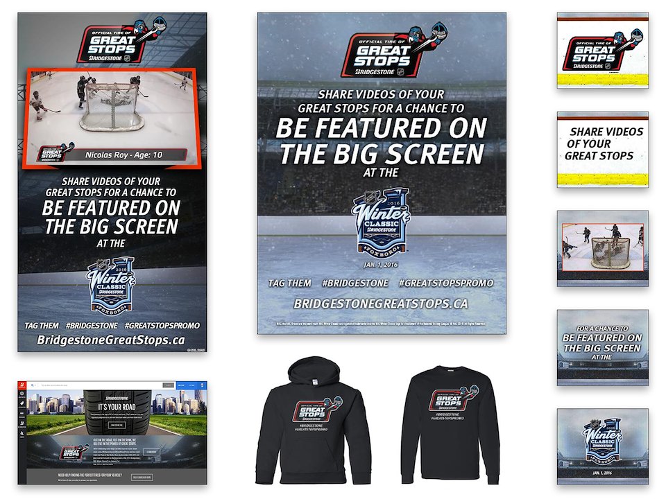 Clockwise: RInk Lobby digital Display, Wild postings, Online Ads, Giveaway apparels, Cross promotional banner of Bridgestone Canada site.