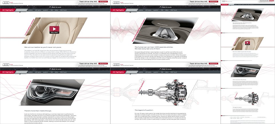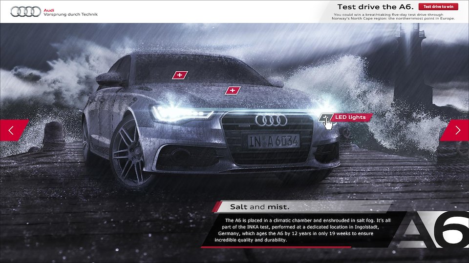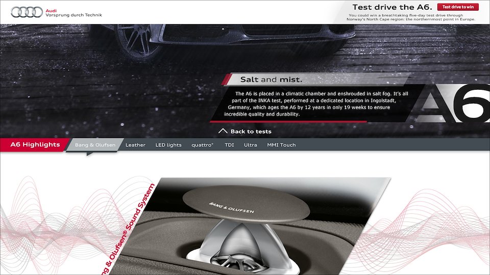 To highlight the rigorous but sometimes dry lab test processes and make them more relatable, we built a responsive website to visually tell the story of which real life situations these tests were mimicking. The dry lab tests were replaced by striking visuals of the A6 in harsh environments.
