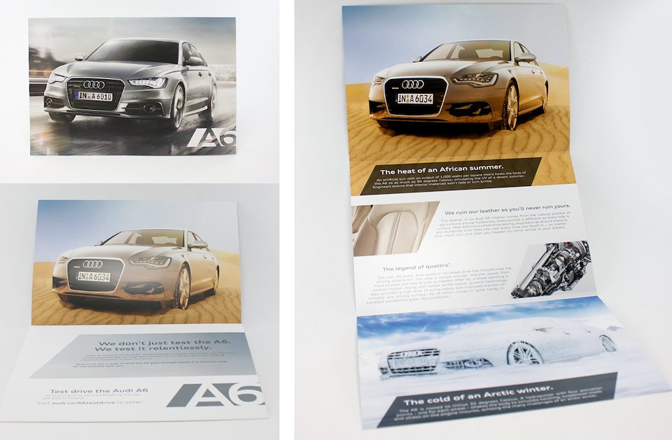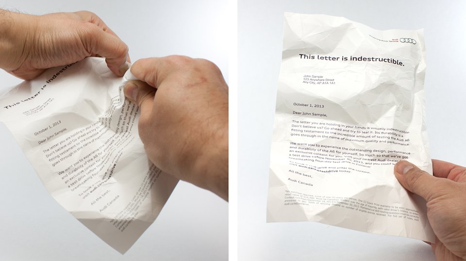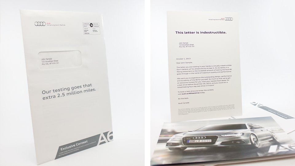 As part of the campaign Audi hand-raisers were sent a DM piece. The letter was printed on a special plastic polymer which made it impossible to tear with bare hands: a fitting testament to the A6's indestructibility.