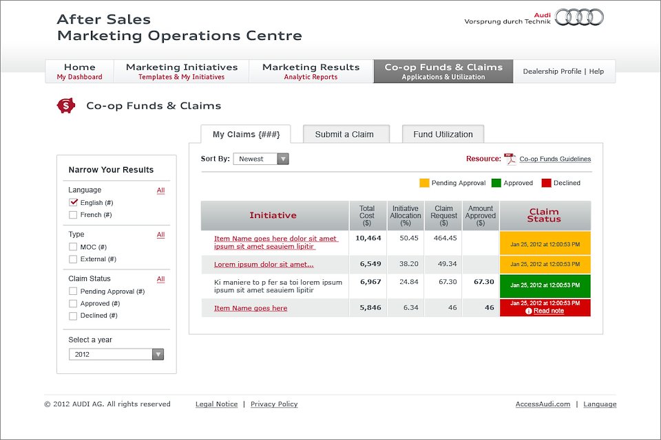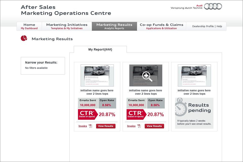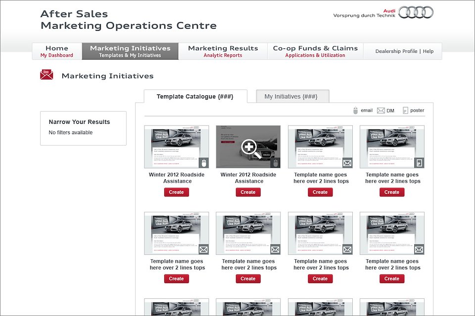 This web portal announced a new era for Audi dealerships; seamless and on-brand communication. Until then each dealership deployed their own ad-hoc, low tech and often off-brand marketing communication. The Marketing Operation Centre (MOC) gives dealerships access to pre-approved, customizable email and print templates which they can deploy right away without having to deal with any other third party vendor.